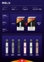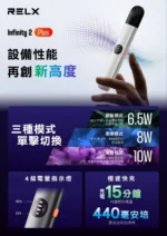 時尚升級再進化,RELX六代主機(Infinity 2)搭載三段功率調整功能,自由切換吸感體驗;支援Type-C快充,配備440mAh電池,續航強勁。相容RELX四、五、六代煙彈,為您帶來更全面、靈活的使用選擇。